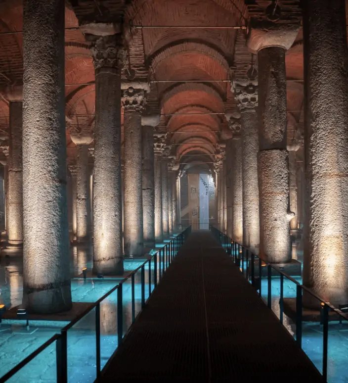 Yerebatan Sarnıcı, İstanbul’da Bizans dönemine ait büyük yeraltı su deposudur; atmosferik sütunları ve Medusa başları ile ünlüdür.